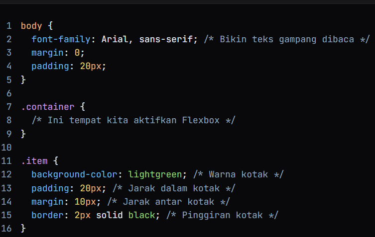 .container:flex-wrap: wrap;– ini bikin kotak “bungkus” ke baris baru kalau layar kecil (responsif kayak hp).